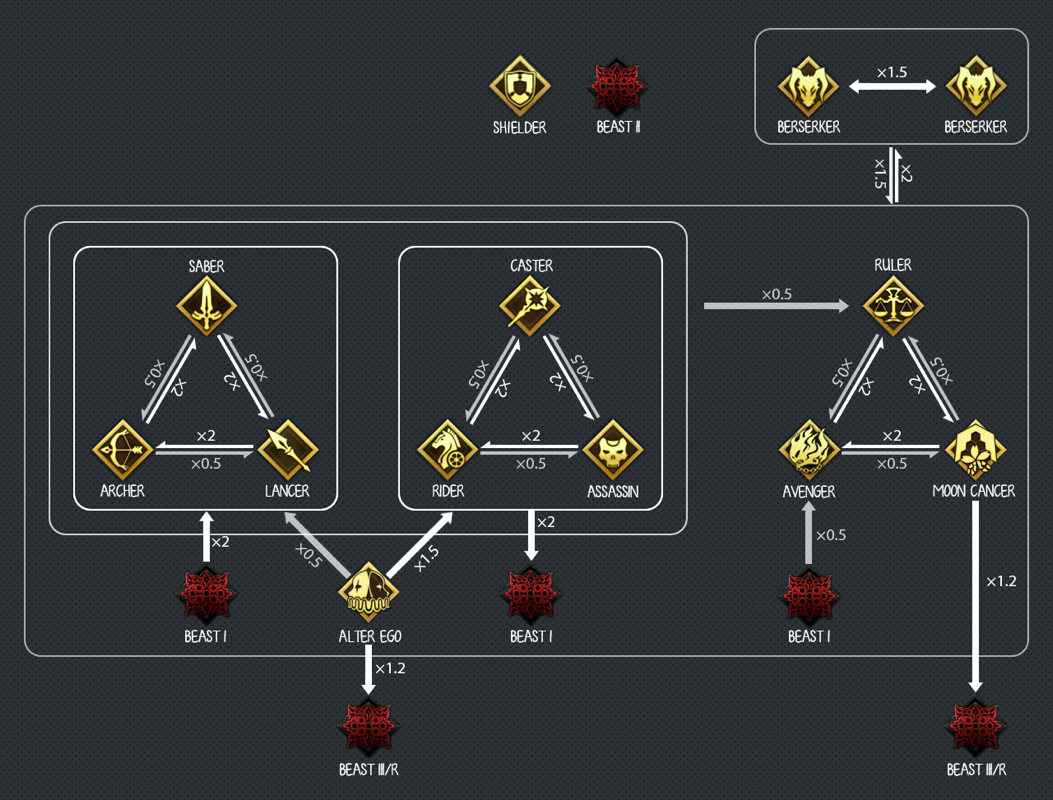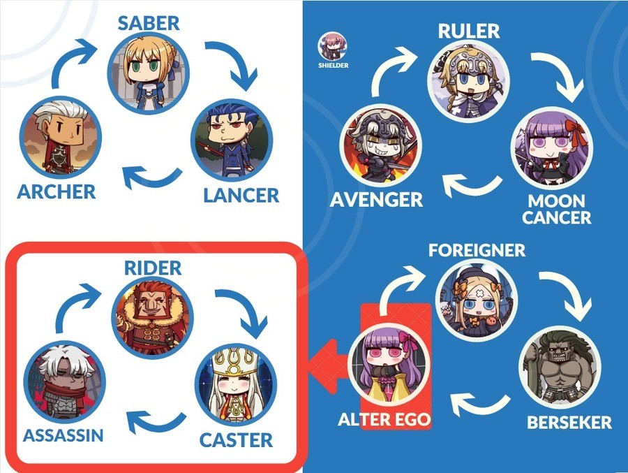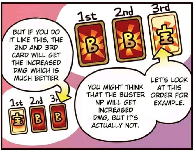 Fate/Grand Order is a turn-based role-playing game with some visual novel elements. The player takes the role of a "Master" and commands a group of individuals called "Servants", who are typically historical, literary, and mythological figures from various cultures. The player commands a party composed of up to 6 Servants in each battle, 3 active members, and 3 reserve members. In each turn, the player is given a set of 5 Command Cards and may use up to 3 of them in a turn to attack. Each Servant has 5 cards the player may use; the cards for all the Servants on the field are shuffled and dealt to the player each turn. The cards have three types: Buster (a heavy attack), Arts (a medium attack that charges a gauge for the Servant's "Noble Phantasm"), and Quick (a light attack that generates Critical Stars that increase the probability of critical hits next turn).